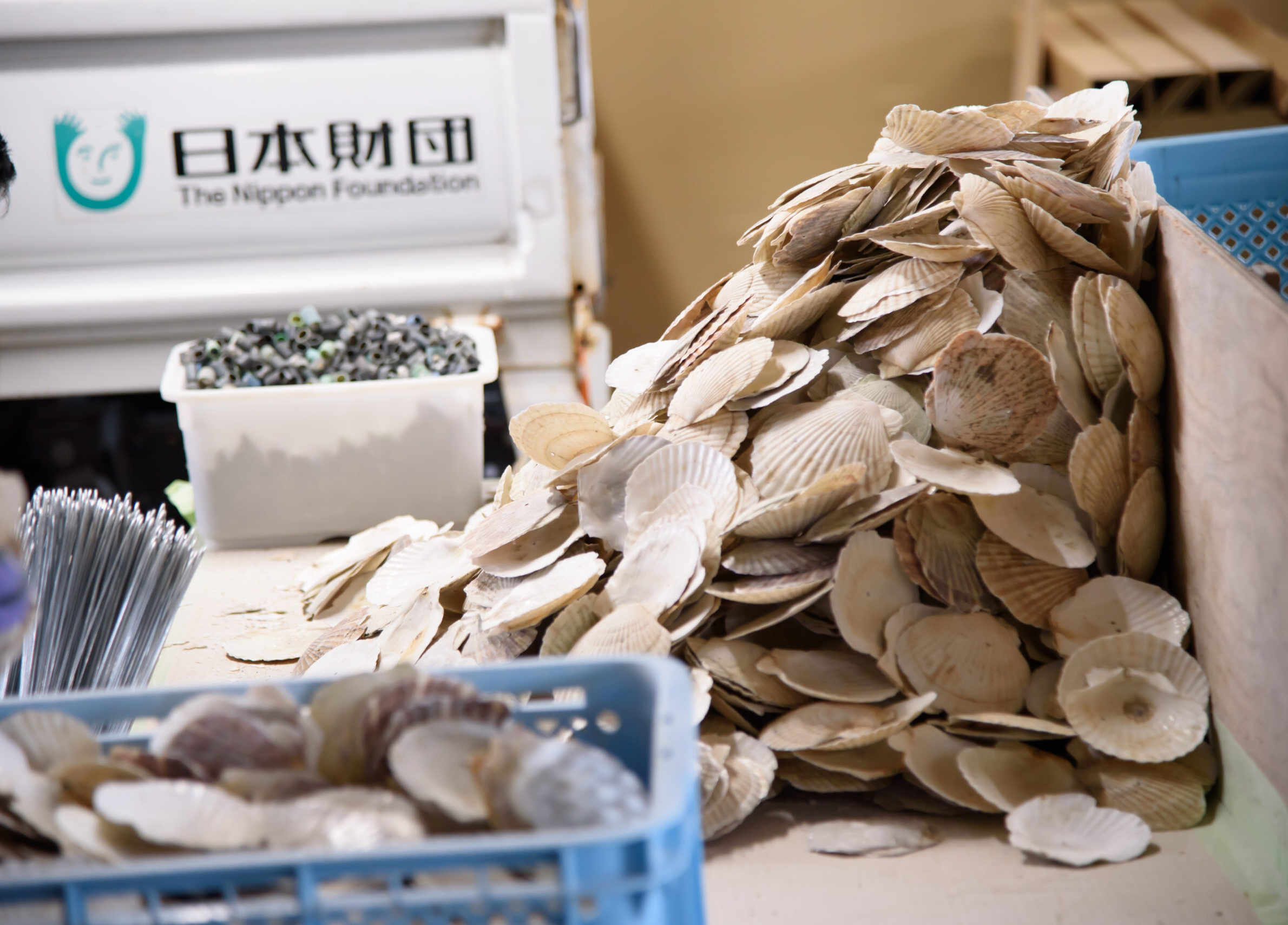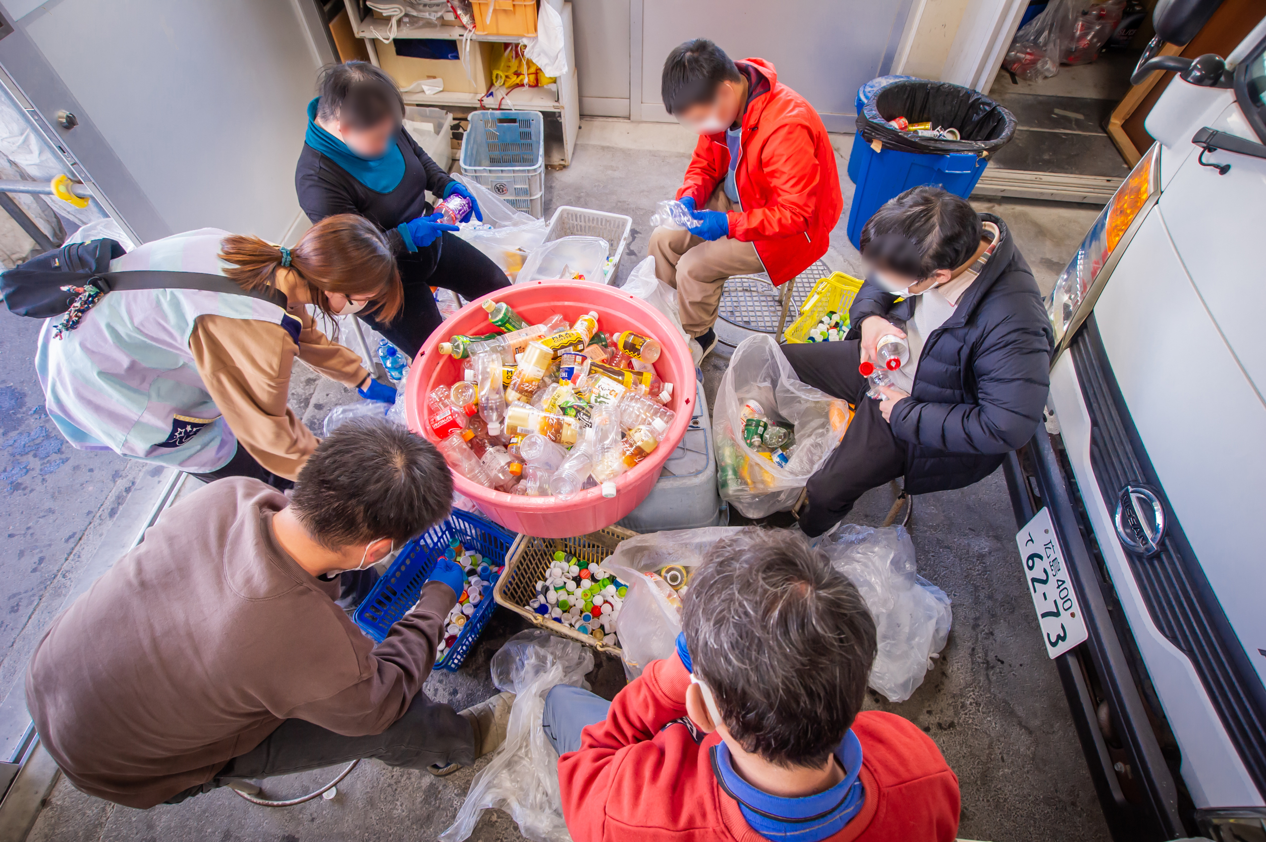 回収されたペットボトルはリサイクルの為に、キャップやラベルを分別する作業を協力して実践しています。